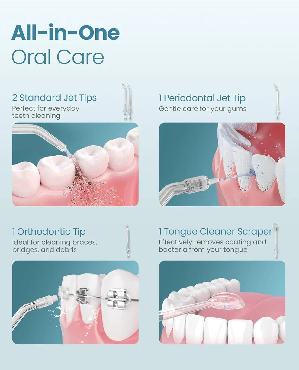 Elevate your oral hygiene with our Water Dental Flosser – designed to deep clean between teeth and along the gumline where brushing alone can’t reach. Gentle yet powerful, it removes plaque, reduces gum issues, and leaves your mouth feeling refreshingly clean every time. Perfect for braces, implants, and sensitive gums – because a confident smile starts with better care.