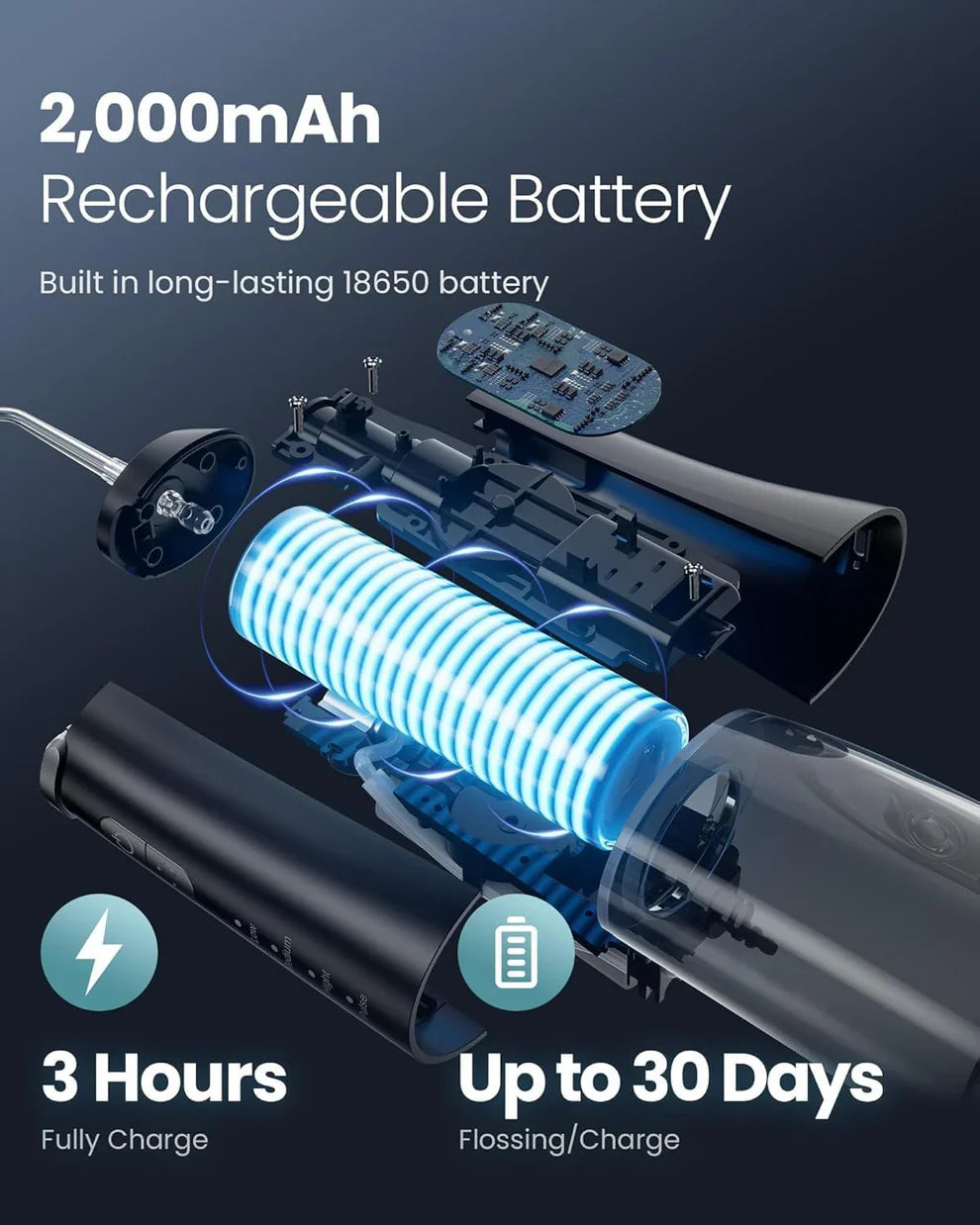 Long-Lasting Battery, Portable Anywhere: Enjoy up to 30 days of use on a 3-hour charge with this compact, lightweight water dental flosser. Ideal for home or travel. Comes with a USB cable (adapter not included) for convenient charging on the go